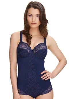 The Jacqueline Lace Body from Fantasie in Navy Blue is designed with all over corded French lace round the body and trim and a soft handle fabric for a smooth silhouette. The three piece cups have a wide wire and elasticated edge for ease of fit, great uplift and forward projection including an inner power net wing with a hook and eye closure for further support. The gusset consists of an hook and eye closure (3 hooks for all sizes) for great comfort and fit. This body is perfect for light control.