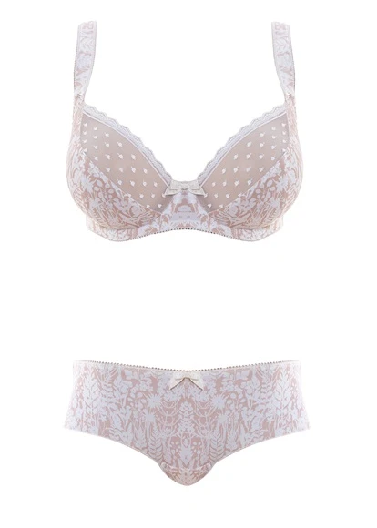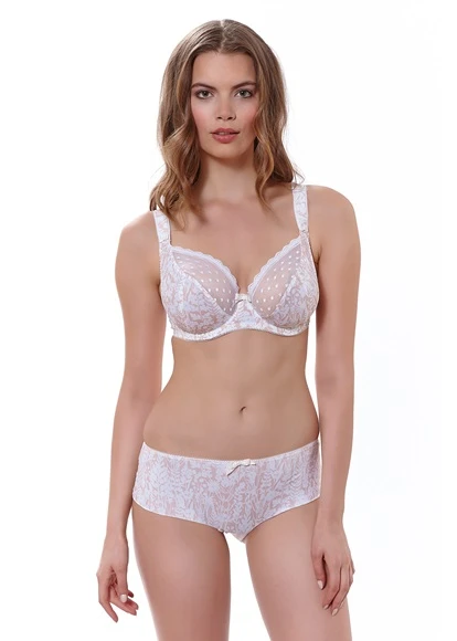 The Fearne Balcony Bra from Freya in Sand is an exciting new collection with subtle tonal printed cups and delicate spotty lace. It has a low centre front for a plunge neckline and new underwires for an improved fit. It is feminine and romantic and offers a great base under any outfit for this season. Co-ordinate with the Freya Fearne Short or the Freya Fearne Brazilian Thong.