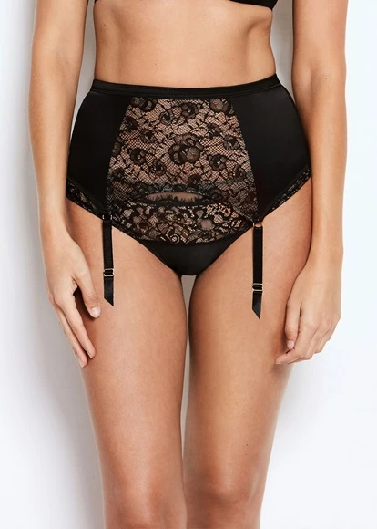 The Abbie Black Suspender Belt from Katherine Hamilton showcases eyelash trim floral lace edged with invisible tulle and sumptuous silk for an elegant and luxurious style. The silk panels offer a comforting secure fit around the body with a rigid centre panel and soft stretch mesh back. Co-ordinate with the Katherine Hamilton Abbie Black Bra.
