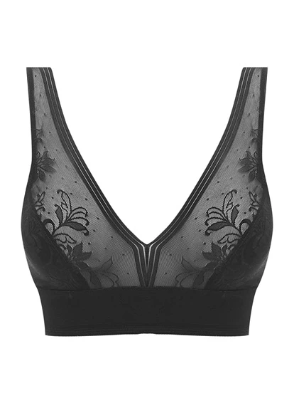 The Net Effects Bralette from Wacoal in Black features a low plunge neckline, soft wide under-band, hook and eye closure and triangular cups to offer unprecedented comfort. This style is perfect for everyday wear and fits up to a D/DD cup. Match with the co-ordinating Wacoal Net Effects Black Short.